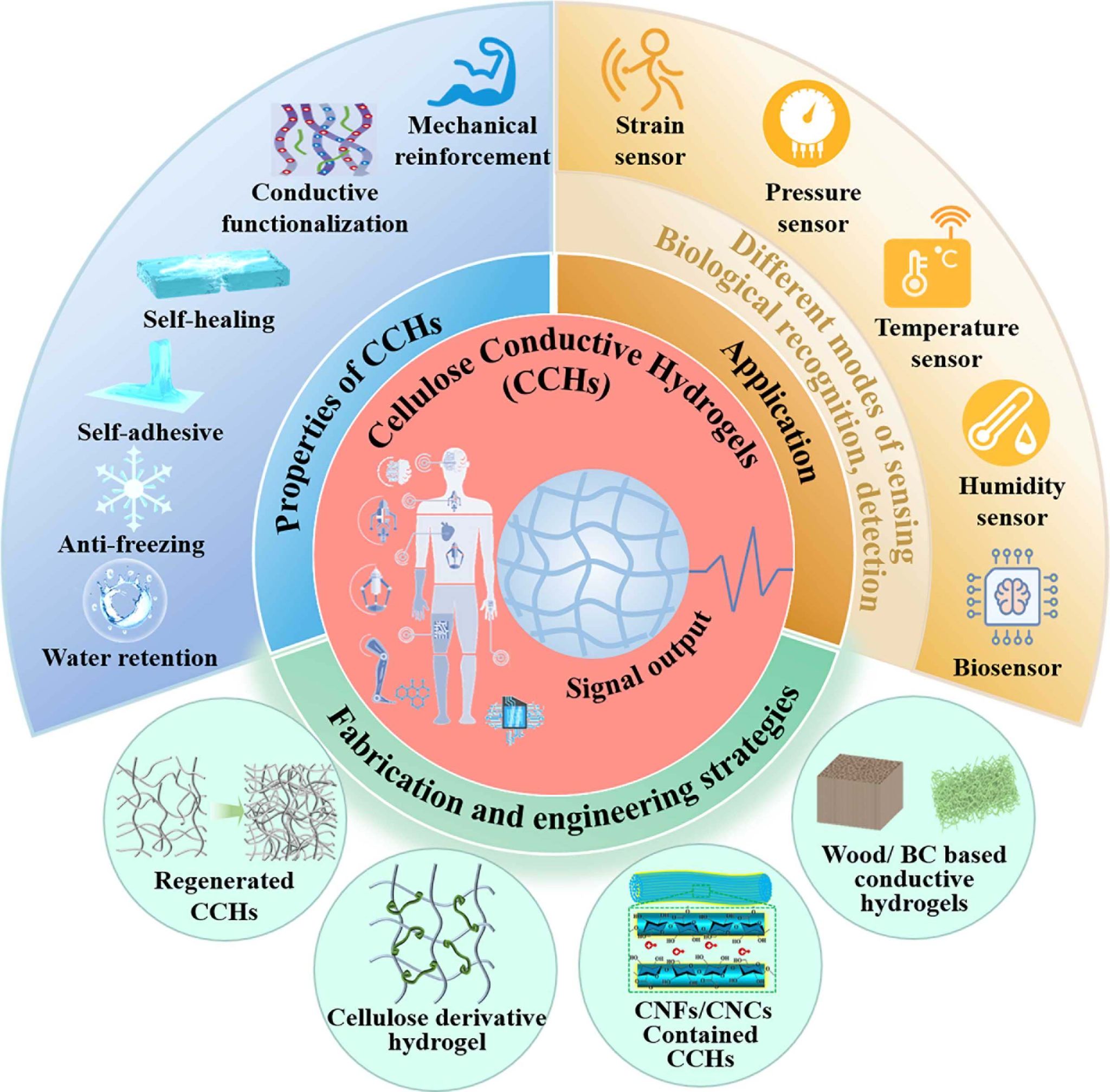 導(dǎo)電水凝膠因其可調(diào)的機(jī)械性能和穩(wěn)定的導(dǎo)電性,成為柔性傳感器開發(fā)的重要基礎(chǔ)材料。在制備“綠色”、高性能柔性傳感器的過程中,源自天然纖維素的柔性水凝膠因其獨(dú)特的可再生、低成本、易改性和機(jī)械性能,其結(jié)構(gòu)和功能設(shè)計正引起越來越多的關(guān)注。本團(tuán)隊(duì)系統(tǒng)綜述了纖維素導(dǎo)電水凝膠的結(jié)構(gòu)特征、材料構(gòu)成和制備方法,重點(diǎn)討論了纖維素導(dǎo)電水凝膠的性能、增強(qiáng)策略和傳感特性之間的相關(guān)性。最后,對纖維素導(dǎo)電水凝膠目前面臨的挑戰(zhàn)及應(yīng)用前景進(jìn)行了展望。該工作以題為“Cellulose-Based Conductive Hydrogels for Emerging Intelligent Sensors”發(fā)表在《Advanced Fiber Materials》上。博士研究生姚雪為本文第一作者,張素風(fēng)教授錢立偉副教授為該論文的共同通訊作者。