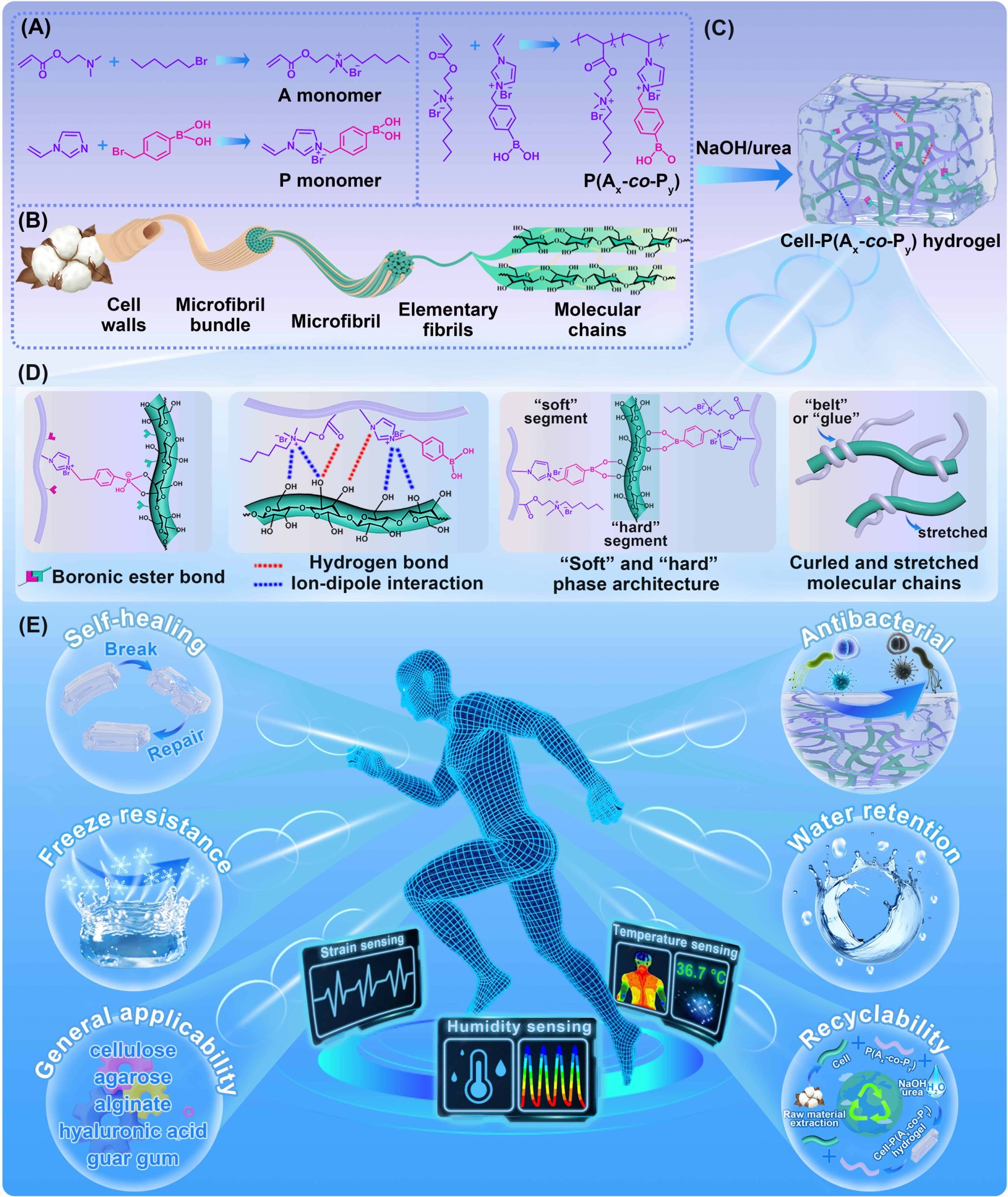 利用天然生物質(zhì)基離子導(dǎo)電水凝膠(ICH)構(gòu)筑柔性電子產(chǎn)品是實(shí)現(xiàn)環(huán)境可持續(xù)性的有效途徑之一。然而,實(shí)現(xiàn)高強(qiáng)度、高韌性、導(dǎo)電性和多功能性的同時確保加工簡便性是極具挑戰(zhàn)的。團(tuán)隊(duì)提出一種基于NaOH/尿素體系,聚離子液體(PIL)大分子功能化策略,以構(gòu)建高性能和多功能的多糖基離子導(dǎo)電水凝膠(例如,纖維素ICH)。該策略中,“軟”(PIL鏈)和“硬”(纖維素主鏈)結(jié)構(gòu)以及交聯(lián)網(wǎng)絡(luò)的動態(tài)共價和非共價鍵賦予水凝膠高機(jī)械強(qiáng)度(9.46±0.23 MPa 壓縮模量)、高拉伸性(214.3%)和韌性(3.64±0.12 MJ m-3)。由于PIL的導(dǎo)電性、設(shè)計靈活性和功能兼容性,水凝膠顯示出高導(dǎo)電性(6.54±0.17 mS cm-1)、自修復(fù)性(94.5±2.0%)、抗菌性、抗凍性、保水性和可回收性。此外,基于水凝膠的刺激響應(yīng)特性,實(shí)現(xiàn)了多模式傳感(應(yīng)變、溫度和濕度)。這種策略也被擴(kuò)展到使用各種多糖(包括瓊脂、海藻酸鹽、透明質(zhì)酸和瓜爾膠)制備水凝膠。該策略為生物質(zhì)基水凝膠的設(shè)計及應(yīng)用開辟了新的視角。