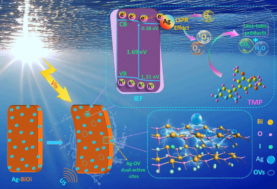 此外,利用銀負(fù)載鉍碘化物(Ag-BiOI)納米片提升三甲氧芐氨(TMP)降解性能。通過引入氧空位(OVs)和銀,顯著提高了催化劑的活性,60分鐘內(nèi)降解效率達(dá)到了97%。這一結(jié)果表明,氧空位和銀作為雙重活性位點(diǎn)在氧化自由基的生成中發(fā)揮了關(guān)鍵作用,從而促進(jìn)了TMP的高效降解。進(jìn)一步的研究評估了所合成的鉍基復(fù)合材料在實(shí)際廢水中的應(yīng)用效果。實(shí)驗(yàn)結(jié)果顯示,該材料在實(shí)際廢水中的催化降解性能顯著,表明其在復(fù)雜藥品廢水處理中的潛力。通過優(yōu)化催化劑濃度和反應(yīng)溫度等關(guān)鍵參數(shù),顯著提高了廢水中污染物的去除效率,為實(shí)際應(yīng)用中的抗生素污染治理提供了有效的技術(shù)支持。