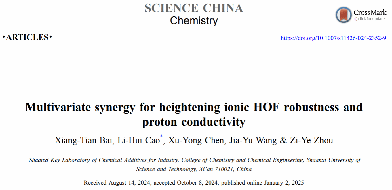 相關(guān)成果以“Multivariate Synergy for Heighten Ionic HOF Robustness and Proton Conductivity”為題,發(fā)表在Science China Chemistry(IF = 10.4)上。陜西科技大學(xué)為唯一通訊單位,化學(xué)與化工學(xué)院2022級(jí)博士研究生白向田為論文的第一作者,曹麗慧教授為唯一通訊作者。