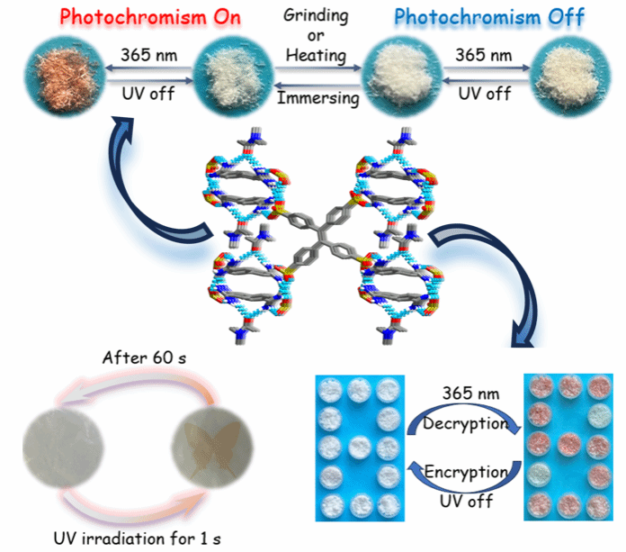 本工作旨在開(kāi)發(fā)具有快速響應(yīng)性的新型功能性雙組分iHOF材料,我們分別通過(guò)對(duì)苯二脒二鹽酸鹽(PAM?2HCl)、1,1'聯(lián)苯-4,4'-雙(羧酰胺)二鹽酸鹽(BPAM?2HCl)和四(4-磺基苯基)乙烯(H4TPE)反應(yīng)成功合成iHOF-17和iHOF-18。其中iHOF-18具有優(yōu)異的光致變色性能,紫外線照射下的光響應(yīng)時(shí)間僅為1秒,其光致變色性能在研磨或加熱時(shí)會(huì)消失,并且可以用特定溶劑恢復(fù)。因此,iHOF-18作為一種可擦除的打印和加密材料顯示出良好的應(yīng)用前景。