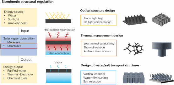 近年來,太陽能界面蒸發(fā)技術(shù)以其低碳排放和高效蒸發(fā)的顯著優(yōu)勢,成為應(yīng)對全球淡水資源短缺的重要解決方案。自然界中生物結(jié)構(gòu)的高效能量利用機(jī)制為這一技術(shù)的發(fā)展提供了寶貴的啟發(fā)。有鑒于此,該論文系統(tǒng)總結(jié)了仿生設(shè)計(jì)在太陽能界面蒸發(fā)器(SIE)中的應(yīng)用,深入分析了仿生結(jié)構(gòu)在增強(qiáng)光吸收、熱管理和水/鹽傳輸性能方面的最新進(jìn)展。此外,該論文還總結(jié)了當(dāng)前仿生設(shè)計(jì)在實(shí)際應(yīng)用和規(guī)?;圃熘忻媾R的挑戰(zhàn)及未來發(fā)展方向。該論文系統(tǒng)梳理了SIE領(lǐng)域中仿生設(shè)計(jì)與制造的關(guān)鍵研究成果,為SIE的性能優(yōu)化構(gòu)建了多維設(shè)計(jì)矩陣,有望為開發(fā)高效、可持續(xù)的太陽能界面蒸發(fā)技術(shù)提供了科學(xué)依據(jù)與創(chuàng)新思路。