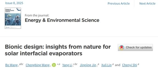 近日,我校材料科學(xué)與工程學(xué)院(文物保護(hù)科學(xué)與技術(shù)學(xué)院)光熱材料的功能化調(diào)控與應(yīng)用創(chuàng)新團(tuán)隊(duì)在材料學(xué)國際頂級期刊《Energy & Environmental Science》(影響因子:32.4)上發(fā)表了題為“Bionic design: insights from nature for solar interfacial evaporators”的綜述性論文,并被選為當(dāng)期Inside Front Cover(內(nèi)封面)。我校王成兵教授、浙江大學(xué)李洋研究員為論文共同通訊作者,碩士研究生王博為論文第一作者,陜西科技大學(xué)為第一通訊單位。該論文的發(fā)表顯著提升了我校在光熱界面蒸發(fā)領(lǐng)域的國際影響力。