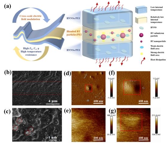 圖1 三明治結(jié)構(gòu)PEI基復(fù)合材料的a) 設(shè)計(jì)思路圖,b) 斷面SEM圖和c) 中間層局部放大SEM圖;d-g) BT微納米顆粒在PEI基體內(nèi)的KPFM圖