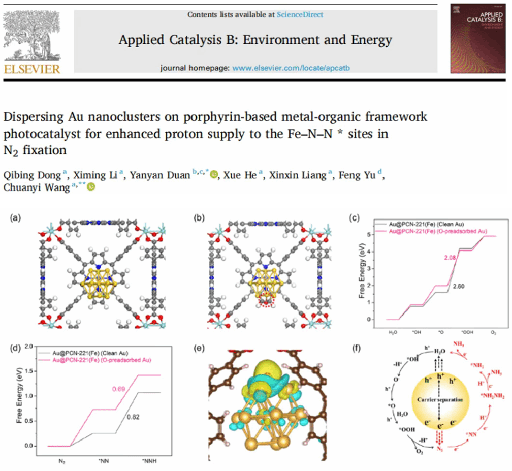相關(guān)成果以“Dispersing Au nanoclusters on porphyrin-based metal-organic framework photocatalyst for enhanced proton supply to the Fe–N–N*?sites in N2 fixation”為題,發(fā)表在Applied Catalysis B: Environment and Energy(IF = 20.2)上。陜西科技大學(xué)為論文第一通訊單位,環(huán)境學(xué)院2021級博士研究生董奇兵為該論文的第一作者,環(huán)境學(xué)院王傳義教授為論文通訊作者。