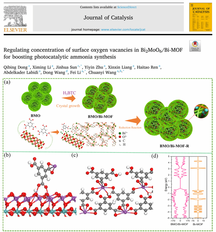系列成果四:表面氧空位(OVs)工程作為提升光催化性能的有效策略已被廣泛采用。然而,目前能夠精準(zhǔn)調(diào)控表面OVs濃度并闡明其對固氮活性影響機(jī)制的光催化體系仍較為匱乏。本研究以Bi2MoO6(BMO)為基底,通過在其表面負(fù)載鉍基金屬有機(jī)框架(Bi-MOF)構(gòu)建可操作平臺,利用Bi-MOF組分中鉍離子的還原特性實(shí)現(xiàn)OVs濃度的精準(zhǔn)調(diào)控。