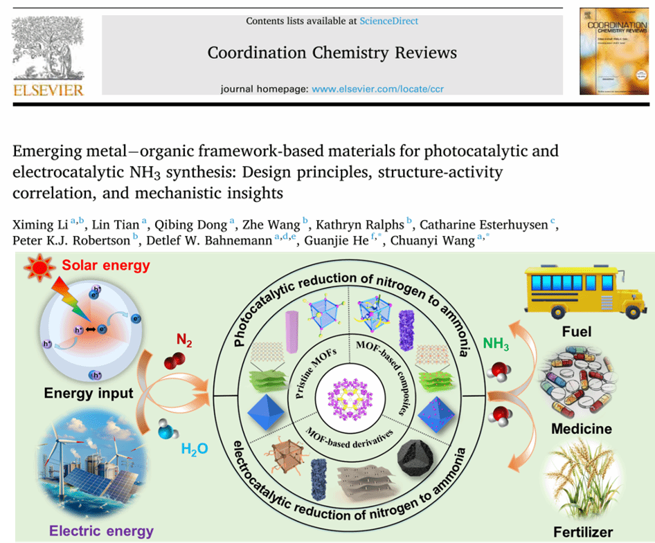 相關(guān)成果以“Emerging metal?organic framework-based materials for photocatalytic and electrocatalytic NH3 synthesis: Design principles, structure-activity correlation, and mechanistic insights”為題,發(fā)表在Coordination Chemistry Reviews(IF = 20.3)上。陜西科技大學(xué)為論文第一通訊單位,論文第一作者為環(huán)境學(xué)院2021級博士研究生李喜明,環(huán)境學(xué)院王傳義教授為論文通訊作者。