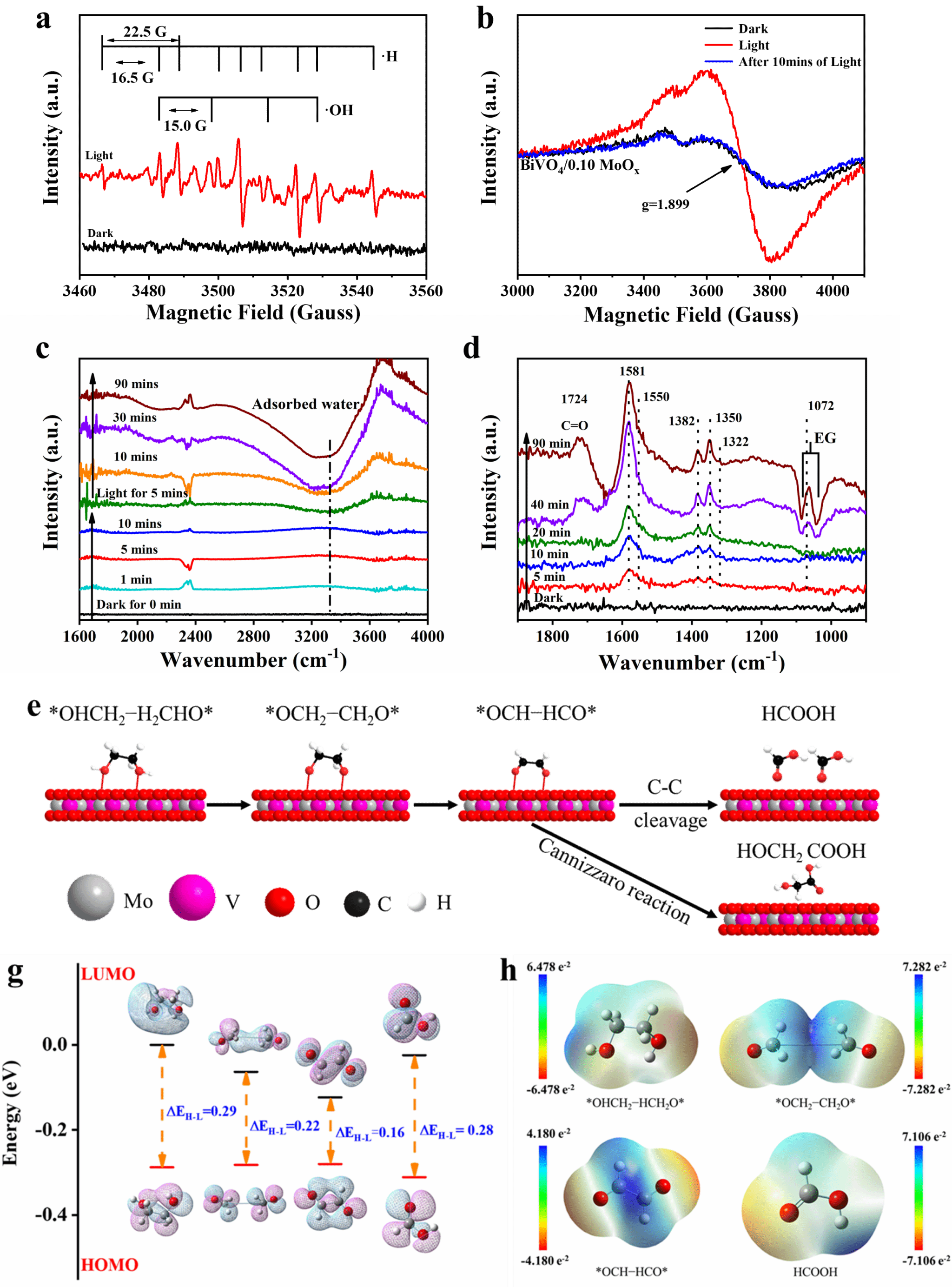 在PET的光重整過程中,MoOx的引入會(huì)誘導(dǎo)BiVO4的光生電子向其遷移,在此過程中Mo6+將被還原為Mo5+,這一過程促進(jìn)了H自由基的生成,從而促進(jìn)產(chǎn)氫。此外,EG在反應(yīng)過程中逐步地被轉(zhuǎn)化為乙二醛及乙二酸,最終形成甲酸并穩(wěn)定存在。