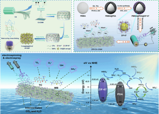 課題組提出使用醋酸纖維素作為靜電紡絲原料,并通過原位沉積、硅烷化改性和冷凍干燥等技術(shù)制備高彈性疏水氣凝膠(T-ENA),用于高效分離油和降解卡馬西平(CBZ)。通過熱固化手段交聯(lián)Si-O-鍵,成功賦予ENA的熱/機(jī)械穩(wěn)定性及疏水性,T-ENA對油水中甲苯的吸附分離效率高達(dá)99.2%,在20分鐘內(nèi)即可活化PMS催化降解99.5%的殘留有機(jī)藥物(CBZ)。同時(shí),通過同步靜電紡絲和靜電噴霧技術(shù),制備了負(fù)載核殼“Z”型異質(zhì)結(jié)催化劑的纖維素基光催化靜電紡絲膜。在光照和PMS的作用下,對TC和MB的降解效率分別達(dá)到93.31%和99.90%。相關(guān)研究成果以“Cellulose acetate-based electrospun nanofiber aerogel with excellent resilience and hydrophobicity for efficient removal of drug residues and oil contaminations from wastewater”和“Facile fabrication of a cellulose-based photocatalytic membrane decorated with core-shell heterojunction microspheres for efficient and continuous wastewater remediation”為題發(fā)表在《Carbohydrate Polymers》和《Separation and Purification Technology》上。23級博士研究生田國棟為本文第一作者,段超教授和倪永浩教授為通訊作者。