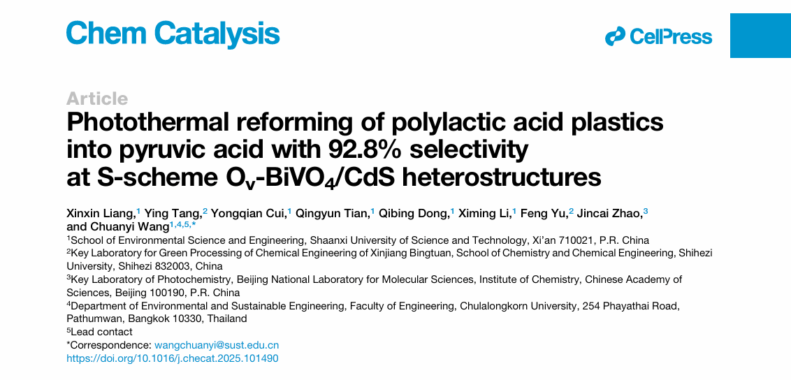 近日,我校王傳義教授團(tuán)隊(duì)在Cell Press細(xì)胞出版社旗下期刊《Chem Catalysis》上發(fā)表了題為“Photothermal reforming of polylactic acid plastics into pyruvic acid with 92.8% selectivity at S-scheme Ov-BiVO4/CdS heterostructures”的研究論文。我校王傳義教授為文章通訊作者,環(huán)境學(xué)院博士生梁芯芯為文章第一作者,陜西科技大學(xué)為唯一通訊單位。