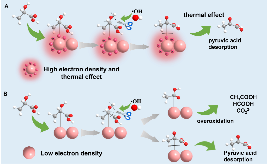 利用光催化方式將聚乳酸(PLA)塑料轉(zhuǎn)化為丙酮酸學(xué)品,對(duì)開(kāi)發(fā)環(huán)境友好且經(jīng)濟(jì)可行的回收技術(shù)、推動(dòng)碳循環(huán)經(jīng)濟(jì)發(fā)展具有重要意義。然而,乳酸催化脫氫生成丙酮酸的過(guò)程中,乳酸分子在催化劑表面的吸附太強(qiáng)會(huì)導(dǎo)致產(chǎn)物無(wú)法脫附,引發(fā)丙酮酸C?C鍵的斷裂從而被過(guò)度氧化的問(wèn)題。同時(shí)由于羥基氧化為羰基的活化能較高,導(dǎo)致該反應(yīng)效率及選擇性較低。因此,當(dāng)前的關(guān)鍵挑戰(zhàn)在于如何有效增強(qiáng)乳酸中的C?C鍵強(qiáng)度激活α?OH的同時(shí),促進(jìn)丙酮酸產(chǎn)物在催化劑表面的脫附過(guò)程。