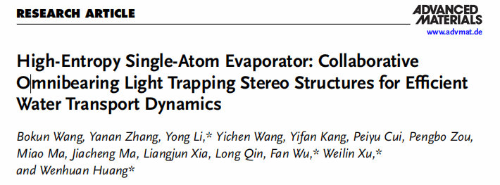 化工學(xué)院黃文歡研究團(tuán)隊(duì)在《Advanced Materials》上發(fā)表了一項(xiàng)高熵單原子陣列蒸發(fā)器促進(jìn)高效海水淡化研究成果