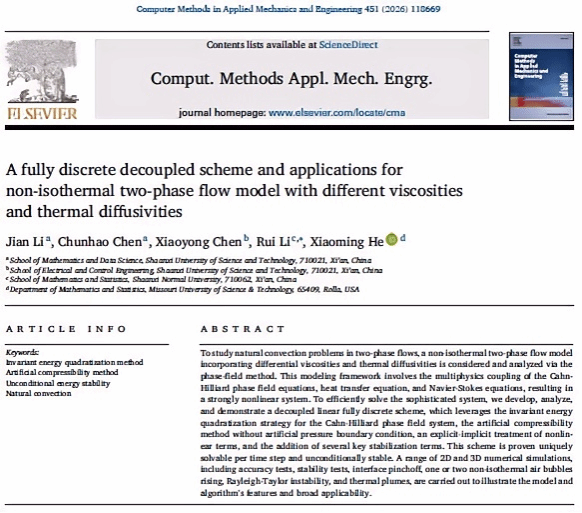 近日,數(shù)學(xué)與數(shù)據(jù)科學(xué)學(xué)院2024級(jí)碩士研究生陳春昊的科研成果“A fully discrete decoupled scheme and applications for non-isothermal two-phase flow model with different viscosities and thermal diffusivities”發(fā)表于計(jì)算力學(xué)三大刊之一Computer Methods in Applied Mechanics and Engineering上。該論文是在導(dǎo)師李劍教授和陜西師范大學(xué)李瑞副教授、美國密蘇里科技大學(xué)何曉明教授共同指導(dǎo)下完成的。這項(xiàng)工作為具有不同粘度和熱擴(kuò)散率的非等溫兩相流模型的高效、解耦、線性、全離散數(shù)值格式的構(gòu)造提供了新的研究策略。該研究成果與李劍教授團(tuán)隊(duì)今年在Journal of Computational Physics上發(fā)表的成果受到了同行的廣泛關(guān)注,先后受邀在中科院、同濟(jì)大學(xué)、南方科技大學(xué)、寧波東方理工大學(xué)等高校及中國數(shù)學(xué)會(huì)計(jì)算數(shù)學(xué)年會(huì)、中國工業(yè)與應(yīng)用數(shù)學(xué)學(xué)會(huì)年會(huì)研討論會(huì)上報(bào)告。