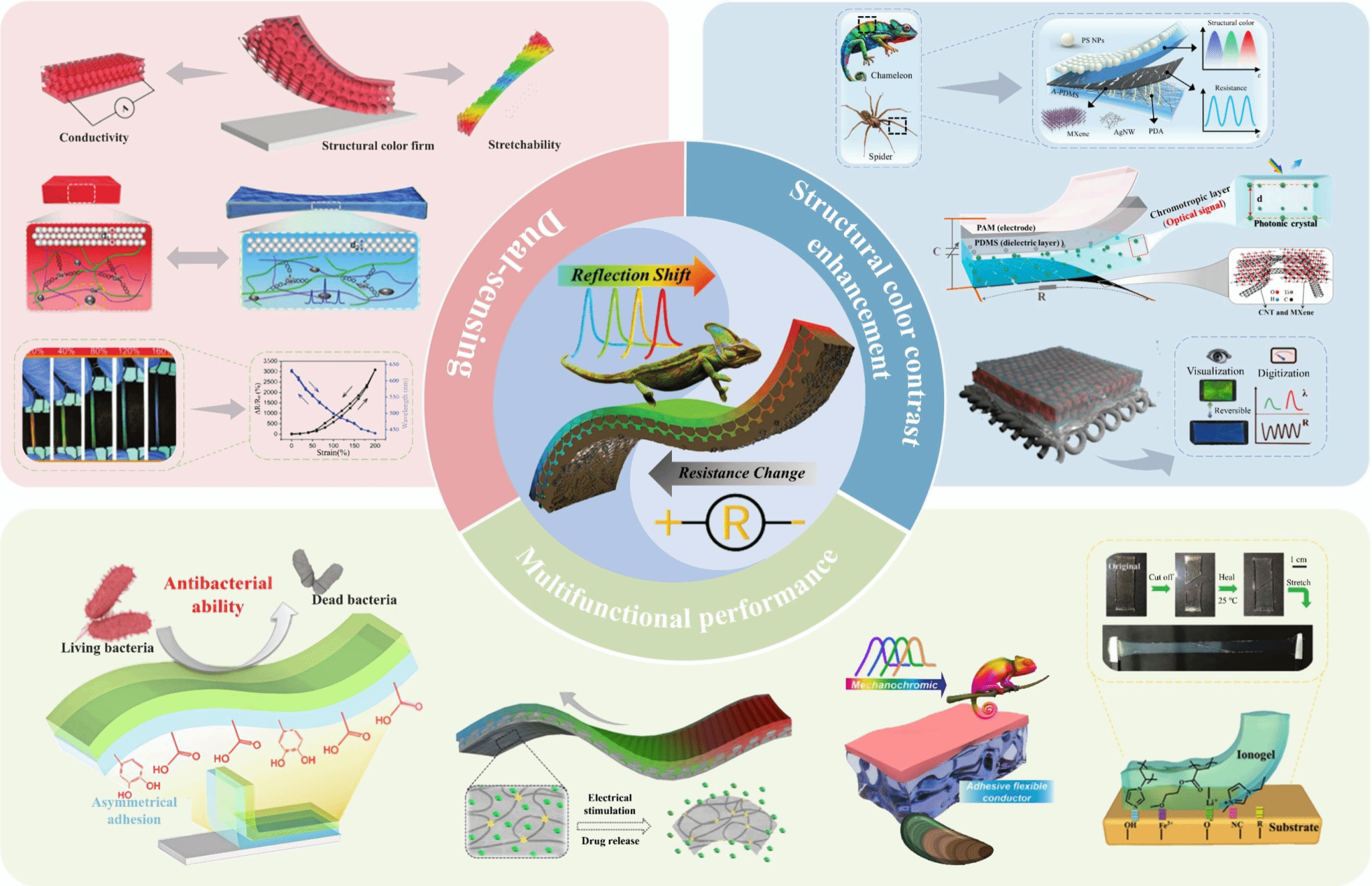 基于在柔性電子與新型傳感技術(shù)方面的研究積累,研究團(tuán)隊(duì)綜述了具有仿生微結(jié)構(gòu)的柔性觸覺(jué)傳感器的前沿進(jìn)展,重點(diǎn)關(guān)注了集成電-光雙信號(hào)輸出的新型設(shè)計(jì)。文章系統(tǒng)闡述了該類傳感器的協(xié)同設(shè)計(jì)機(jī)制、性能優(yōu)化策略及其在電子皮膚、健康監(jiān)測(cè)等領(lǐng)域的應(yīng)用前景與挑戰(zhàn),為多模態(tài)柔性感知系統(tǒng)的發(fā)展提供了理論參考。