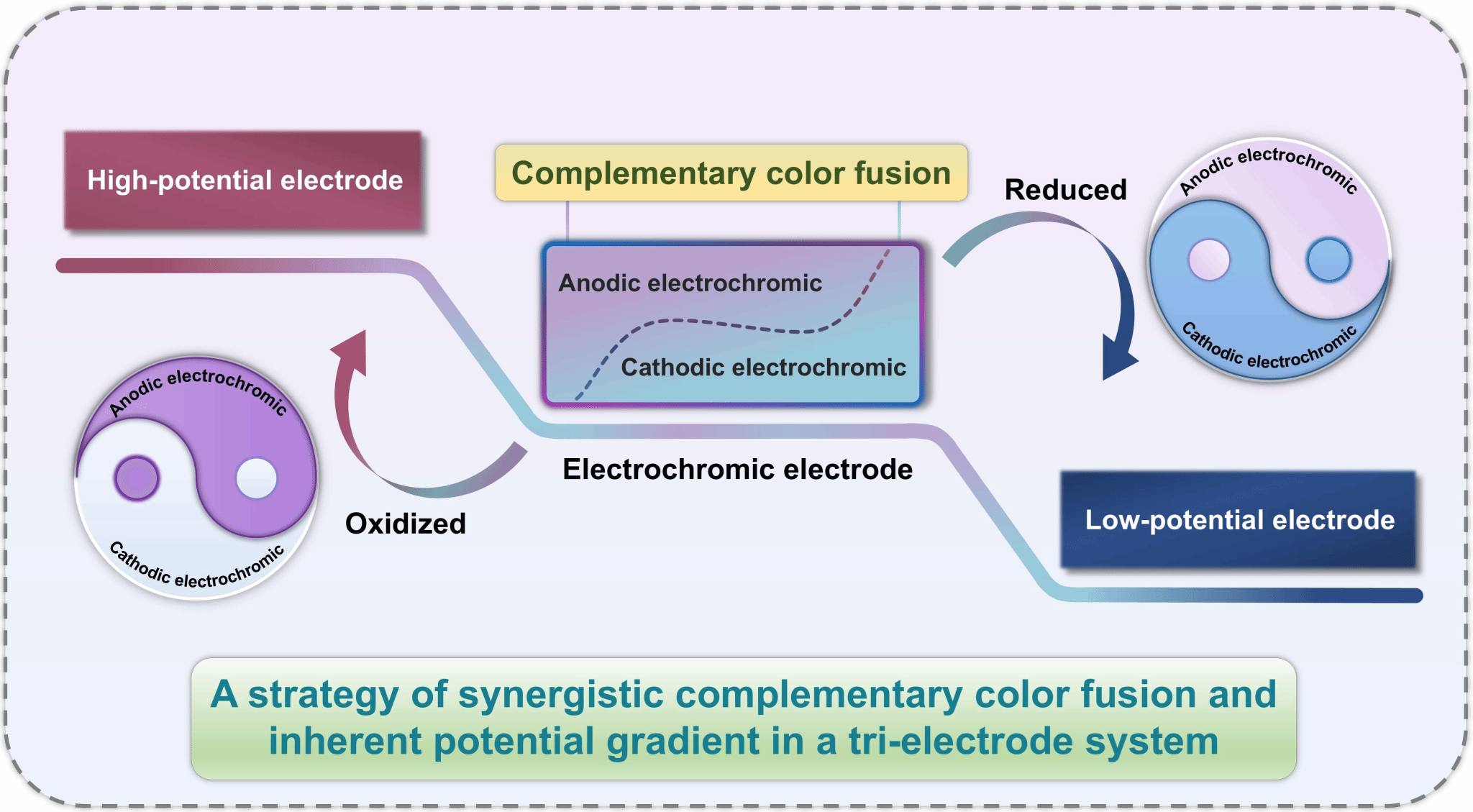 隨著柔性電子與可持續(xù)能源技術(shù)的飛速發(fā)展,開(kāi)發(fā)兼具信息顯示與能量管理功能的新型器件成為前沿?zé)狳c(diǎn)。本工作創(chuàng)新性地提出了一種新型的自供電電致變色系統(tǒng)。該系統(tǒng)利用陰陽(yáng)極電致變色材料的互補(bǔ)顏色融合效應(yīng)實(shí)現(xiàn)豐富的顏色變化,并以系統(tǒng)內(nèi)部的固有電勢(shì)梯度為驅(qū)動(dòng)力,實(shí)現(xiàn)了快速可逆的多色切換,擺脫了傳統(tǒng)器件對(duì)外部電源的依賴。此外,該系統(tǒng)還可通過(guò)靈活的電極組合,實(shí)現(xiàn)多種功率的電能輸出模式并伴隨相應(yīng)的顏色指示?;谏鲜鎏匦?,該系統(tǒng)已成功應(yīng)用于可重構(gòu)多色顯示陣列與觸控式智能標(biāo)簽,在動(dòng)態(tài)信息顯示、交互式包裝等領(lǐng)域展現(xiàn)出廣闊的應(yīng)用前景。