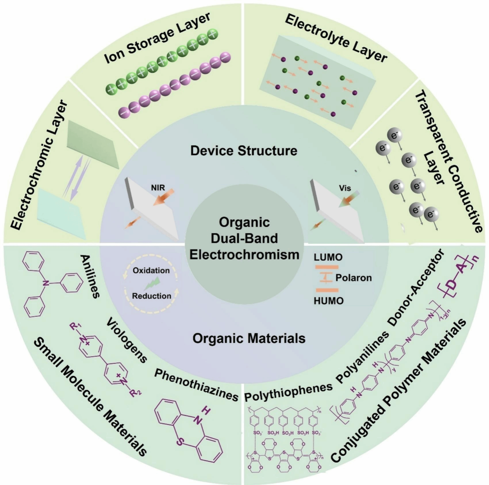 基于團(tuán)隊(duì)在光調(diào)制與智能顯示領(lǐng)域的長(zhǎng)期研究基礎(chǔ),本綜述系統(tǒng)梳理了有機(jī)雙波段電致變色方向的最新進(jìn)展。文章重點(diǎn)闡述了該類材料與器件的工作機(jī)制、設(shè)計(jì)策略(涵蓋小分子與聚合物體系)及性能優(yōu)化路徑,總結(jié)了當(dāng)前面臨的關(guān)鍵挑戰(zhàn),并對(duì)未來(lái)發(fā)展趨向作出展望。該工作為設(shè)計(jì)開(kāi)發(fā)高性能雙波段電致變色材料與器件提供了堅(jiān)實(shí)的理論支撐。