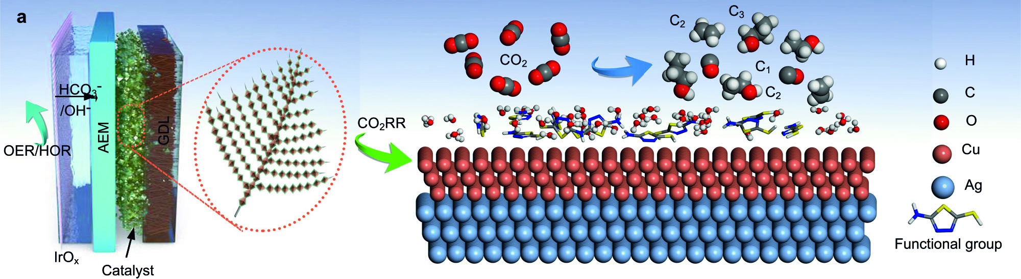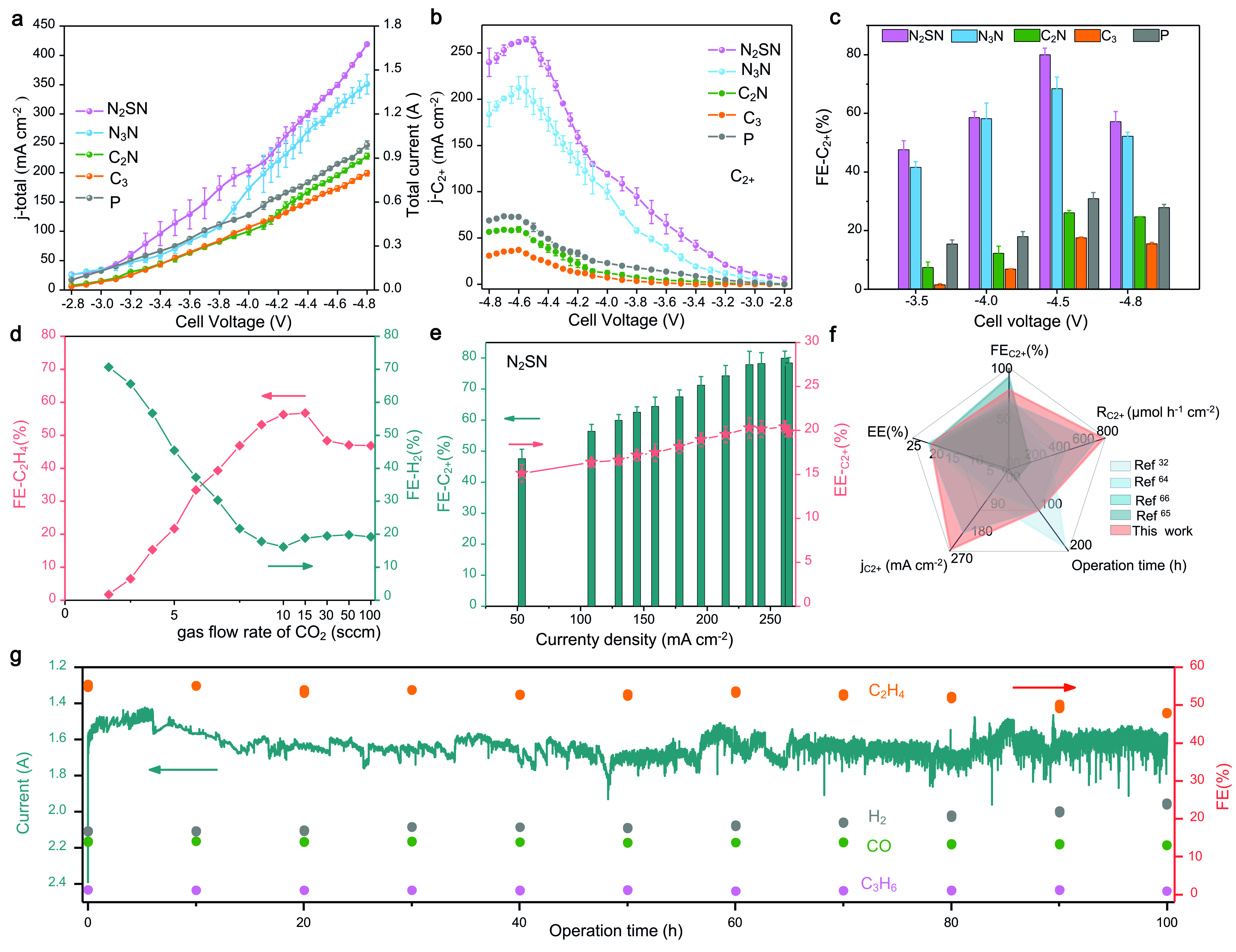 針對(duì)CO2轉(zhuǎn)化研究急需突破性技術(shù)創(chuàng)新的實(shí)際,我校李季博士聯(lián)合法國科學(xué)院歐洲膜所的Damien Voiry研究員團(tuán)隊(duì),采用電沉積方法在碳紙表面合成了Cu基催化劑,隨后使用含有氮硫的雜環(huán)作為功能化試劑,對(duì)Cu基催化劑進(jìn)行改性。通過研究發(fā)現(xiàn),改性的Cu基催化劑展現(xiàn)出CO2高性能轉(zhuǎn)化性能,主要產(chǎn)物為更具有高附加值的工業(yè)原料—C2H4,氮硫雜環(huán)改性的Cu基催化劑與未經(jīng)表面功能化的Cu基催化劑及現(xiàn)有其它催化劑相比,其CO2的C2+產(chǎn)品轉(zhuǎn)化選擇性更高,轉(zhuǎn)化效率達(dá)到80%左右。其次,該催化劑具有較高的能量轉(zhuǎn)化效率,可以有效地降低轉(zhuǎn)化過程中的能耗,另外,該催化劑的使用壽命超過100h,且工作狀態(tài)下的電流密度達(dá)300~400 mA cm-2,工業(yè)利用前景廣闊。對(duì)于我國二氧化碳大規(guī)模資源化利用、減少溫室氣體排放具有重要意義,也將有力地豐富我國的節(jié)能減排方式,成為實(shí)現(xiàn)碳中和的途徑之一。