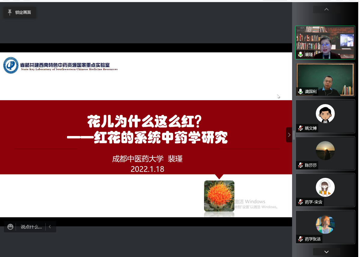 裴瑾以“紅花的系統(tǒng)中藥學(xué)研究”為題進(jìn)行學(xué)術(shù)報(bào)告,首先圍繞川藥紅花進(jìn)行了系統(tǒng)性的質(zhì)量及藥用品種研究評(píng)價(jià):紅花臨床應(yīng)用范圍廣泛,食用和藥用價(jià)值巨大,作為“君藥”,對(duì)包括新冠在內(nèi)的多種疾病都具有明顯的治療效果。裴以“辯色論質(zhì)理念”對(duì)紅花藥材進(jìn)行質(zhì)量評(píng)價(jià),并進(jìn)一步從評(píng)價(jià)-藥效關(guān)系角度研究了紅花的活血化瘀功效,同時(shí)基于ISO國(guó)際標(biāo)準(zhǔn)為中藥走向國(guó)際做了大量的鋪墊工作。接著以“桃紅四物湯”為例,對(duì)紅花的主要成分進(jìn)行了生物學(xué)活性研究,在炮制的古今差異性研究中做到“尊古,宜今”,對(duì)不同工藝的炮制進(jìn)行了化學(xué)成分以及藥效的差異分析,并探究藥理學(xué)機(jī)制。最后,她為廣大師生詳細(xì)的介紹了紅花的發(fā)展歷史、研究現(xiàn)狀、前沿動(dòng)態(tài),對(duì)基于經(jīng)典名方的中藥現(xiàn)代化分享了寶貴的經(jīng)驗(yàn)。同時(shí),還結(jié)合陜西秦巴山區(qū)豐富的中醫(yī)藥資源,為我校藥學(xué)專業(yè)學(xué)科結(jié)合當(dāng)?shù)靥厣_(kāi)展研究和教育提出了寶貴的建議,為我校新藥研發(fā)及藥理活性研究提供了重要的借鑒和指導(dǎo)意義。