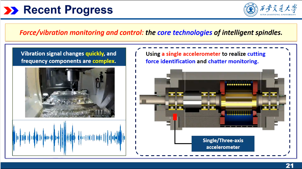 曹宏瑞分享了機床主軸的歷史沿革和國內(nèi)外研究現(xiàn)狀,說明了智能機床又被稱為是“工業(yè)母機”,主軸作為機床的核心功能部件,其性能直接決定機床整機的技術(shù)水平。隨著航空航天和軍工能源等重大領(lǐng)域?qū)Ω咚俑咝Ш透呖煽考庸さ钠惹行枨笠约爸悄軝C床的發(fā)展,主軸單元智能化勢在必行。向大家講解了狀態(tài)監(jiān)測診斷與振動控制作為智能主軸核心特征的集中體現(xiàn),是保障主軸高效可靠工作的核心要素。展示了課題組通過集成壓電作動器、振動傳感器等裝置,開發(fā)出的具備振動監(jiān)控功能的智能主軸。并提出了利用壓電作動器,通過模糊控制策略對高速銑削顫振進行主動控制和銑削穩(wěn)定性提升的先進方法。
