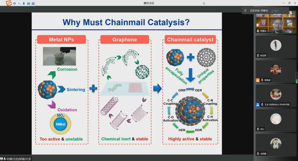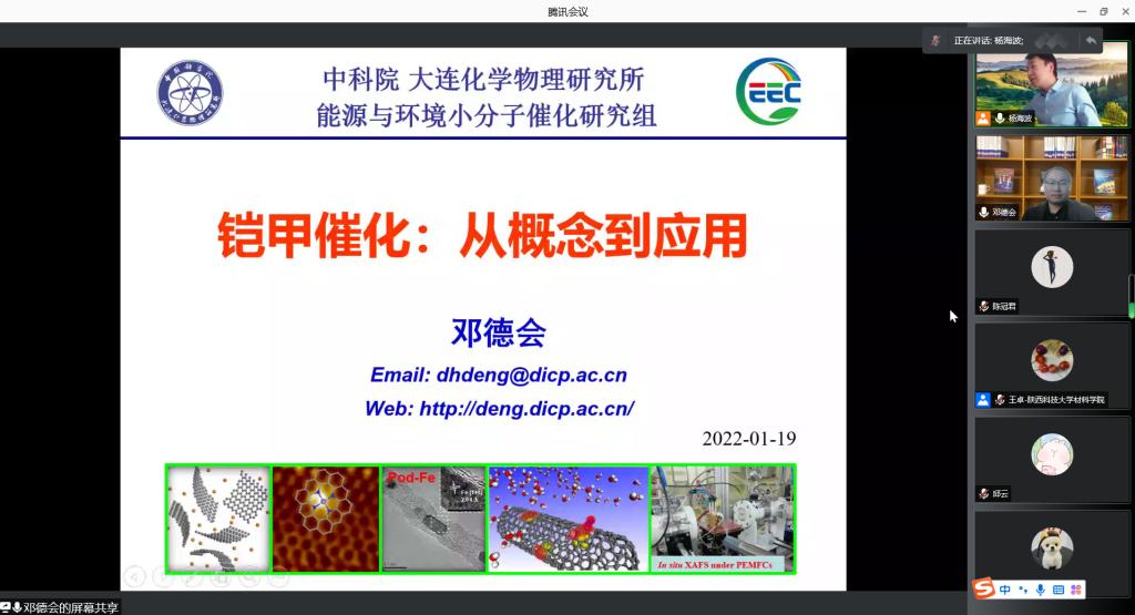 1月19日上午,應(yīng)我校科技處、前沿院和材料科學(xué)與工程學(xué)院邀請(qǐng),大連化物所鄧德會(huì)研究員做客我?!扒把乜茖W(xué)報(bào)告”,作了題為“鎧甲催化:從概念到應(yīng)用”的線上學(xué)術(shù)報(bào)告。報(bào)告由教務(wù)處處長(zhǎng)楊海波教授主持,材料學(xué)院部分師生參加了此次學(xué)術(shù)報(bào)告會(huì)。