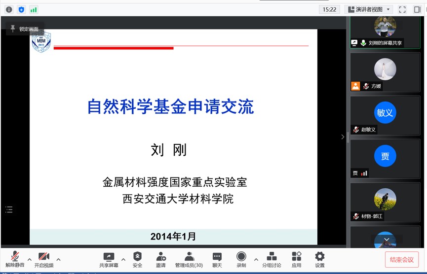 1月16日上午,應我校材料科學與工程學院邀請,西安交通大學劉剛教授做客我校“前沿科學報告”,作了題為“國家自然科學基金申請的幾點體會”的線上學術(shù)報告。報告由材料學院院長朱建鋒教授主持,材料學院相關專業(yè)教師及部分研究生參加了此次報告會。