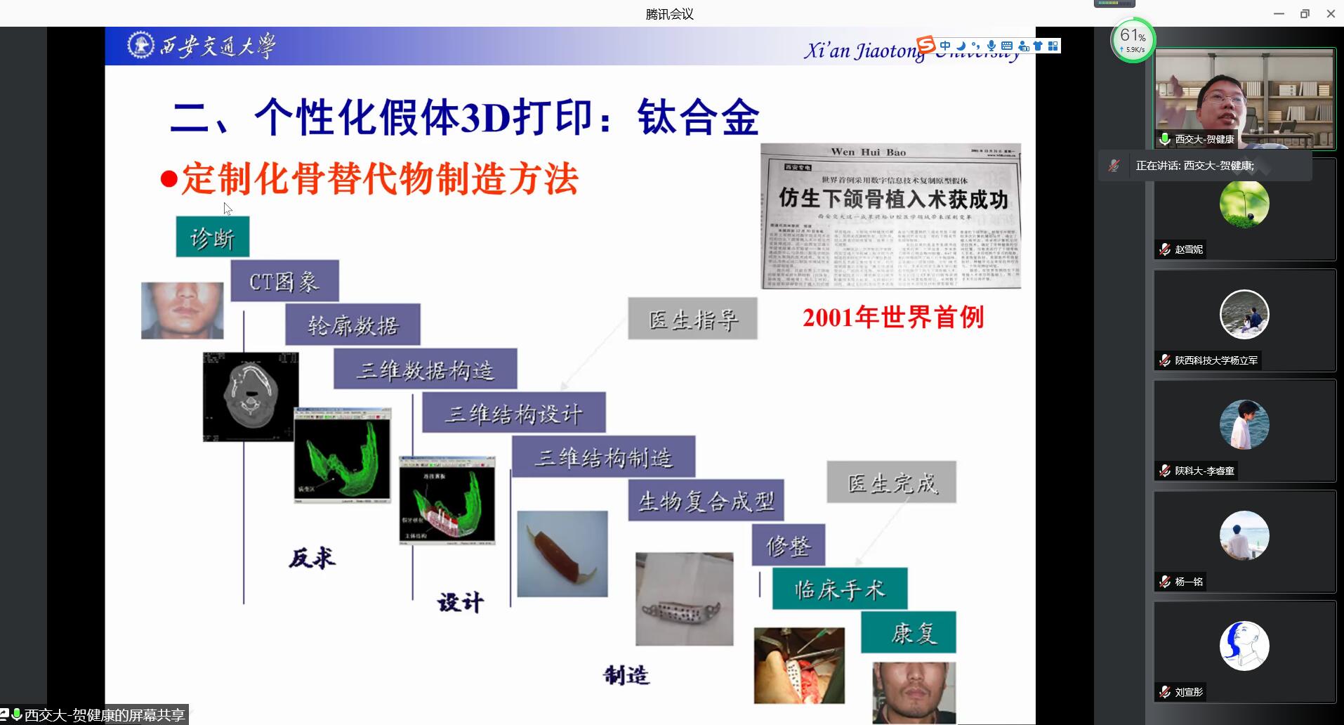 賀健康從3D打印的醫(yī)學(xué)應(yīng)用、個(gè)性化假體3D打印、可降解支架3D打印、微納生物3D打印四個(gè)方面,講解了國(guó)內(nèi)外生物3D打印領(lǐng)域的研究前沿和發(fā)展動(dòng)態(tài)。對(duì)相關(guān)研究方向在申請(qǐng)國(guó)家自然科學(xué)基金時(shí)如何緊跟國(guó)內(nèi)外生物3D打印領(lǐng)域前沿、獨(dú)辟蹊徑、深挖科學(xué)問(wèn)題提供了建設(shè)性的思路。通過(guò)他們團(tuán)隊(duì)科研成果落地醫(yī)院臨床應(yīng)用的大量實(shí)例,講述了科學(xué)家、醫(yī)生、工程師如何成功合作,服務(wù)人類健康,挽救患者生命及提高人民生活質(zhì)量,貢獻(xiàn)生物3D打印科研人員的力量。對(duì)我校生物3D打印研究服務(wù)陜西地方經(jīng)濟(jì),加快裝備與產(chǎn)品產(chǎn)業(yè)化應(yīng)用帶來(lái)了寶貴經(jīng)驗(yàn)。最后,賀健康在3D打印與臨床醫(yī)學(xué)結(jié)合、假體制造、支架與活性器官制造宏微結(jié)構(gòu)一體化、3D打印技術(shù)等醫(yī)工交叉領(lǐng)域如何創(chuàng)新性地開(kāi)展科研給出了可操作性的建議。報(bào)告不僅對(duì)學(xué)院生物3D打印領(lǐng)域技術(shù)研究具有重要的借鑒和指導(dǎo)意義,同時(shí)對(duì)學(xué)院仿生制造技術(shù)與理論學(xué)科方向發(fā)展及博士點(diǎn)建設(shè)具有重要的促進(jìn)作用。