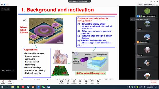 秦勇教授主要介紹了壓電納米發(fā)電機的設(shè)計及性能優(yōu)化,和摩擦納米發(fā)電機方面最新的研究成果。報告現(xiàn)場氣氛熱烈,參會師生就感興趣的方面,與秦勇教授進行了熱切的交流。交流過程中,雙方都迸發(fā)出許多新的想法和火花,參會師生表示受益匪淺。