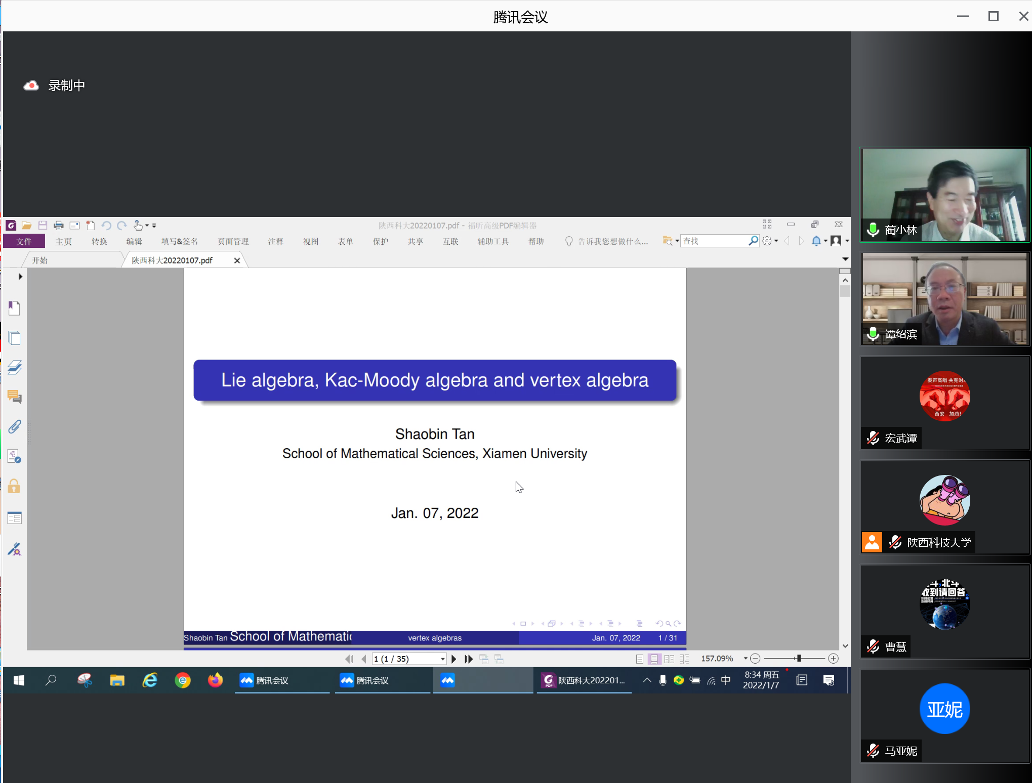1月7日上午,應(yīng)數(shù)學(xué)與數(shù)據(jù)科學(xué)學(xué)院邀請,廈門大學(xué)譚紹濱教授做客我校“前沿科學(xué)報告”,做了題目為“From Lie algebra, Kac-Moody algebra to vertex algebra”的學(xué)術(shù)報告。報告會由數(shù)學(xué)與數(shù)據(jù)科學(xué)學(xué)院院長藺小林教授主持,學(xué)科辦主任郭改慧教授、副院長李劍教授、數(shù)學(xué)學(xué)科教師和研究生聆聽了此次報告。