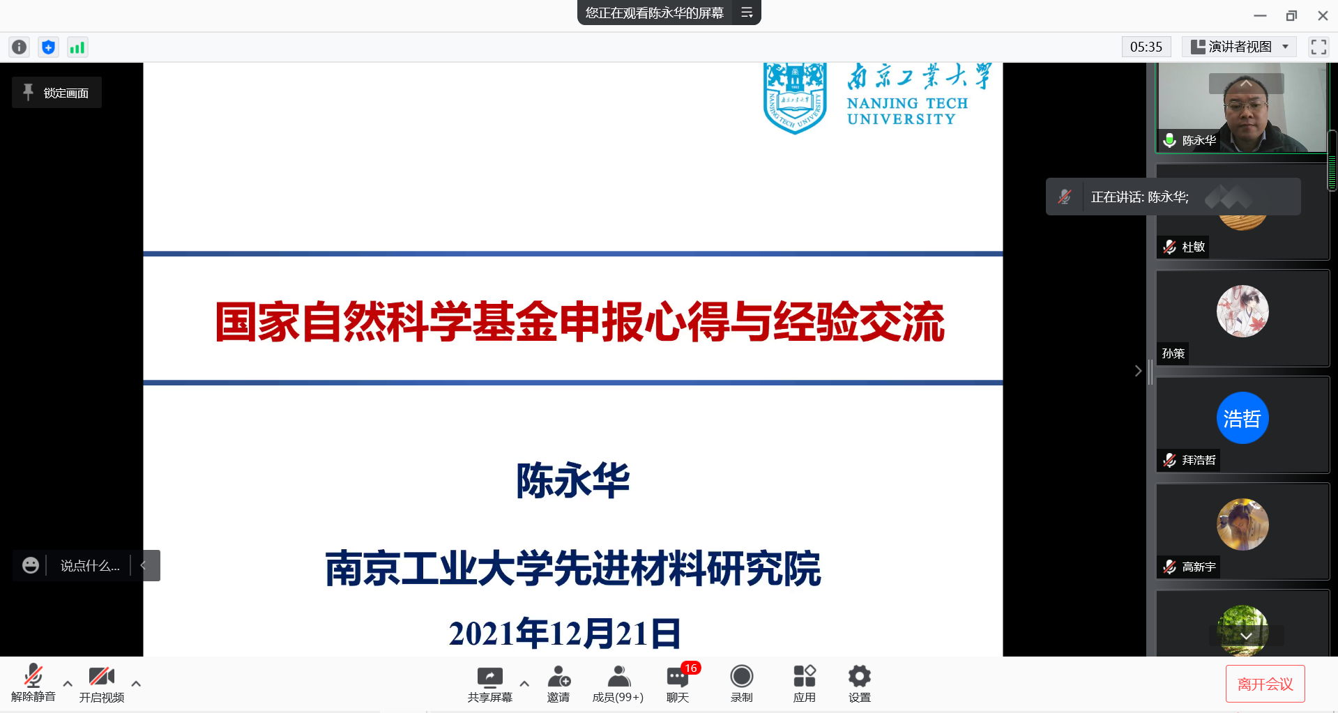 12月21日下午,受我校輕工科學(xué)與工程學(xué)院、科技處及前沿院邀請(qǐng),南京工業(yè)大學(xué)陳永華教授以線上形式作了題為“國(guó)家自然科學(xué)基金申報(bào)心得與經(jīng)驗(yàn)交流”以及“離子液體鈣鈦礦光伏電池”的精彩報(bào)告,本次報(bào)告會(huì)由輕工學(xué)院副院長(zhǎng)劉國(guó)棟主持,學(xué)院相關(guān)專業(yè)教師及研究生聆聽(tīng)了本次報(bào)告。