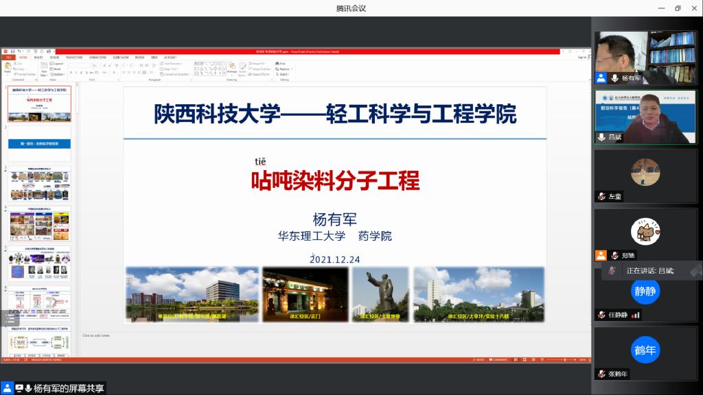 12月24日下午,應(yīng)輕工科學(xué)與工程學(xué)院、科技處及前沿院邀請(qǐng),華東理工大學(xué)楊有軍教授做客我?!扒把乜茖W(xué)報(bào)告”,作了題為“呫噸染料分子工程”的線上學(xué)術(shù)報(bào)告。報(bào)告由輕工學(xué)院院長(zhǎng)呂斌主持,學(xué)院相關(guān)專業(yè)教師、研究生及本科生參加了本次報(bào)告。