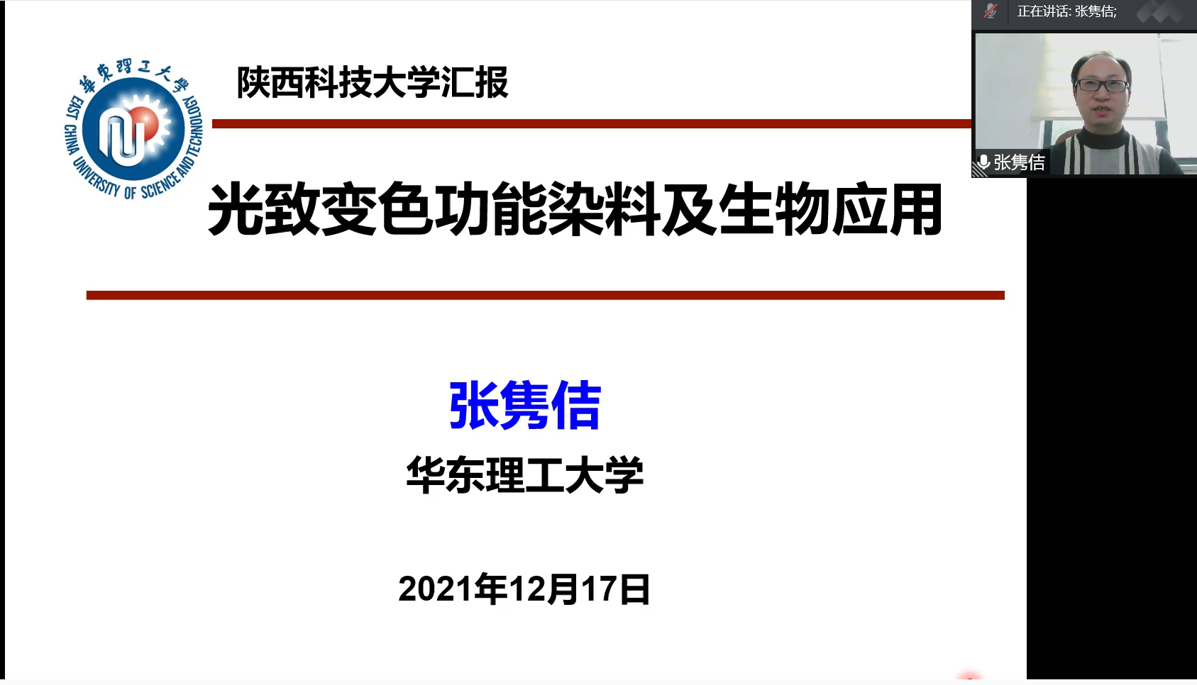 12月17日下午,應(yīng)我校輕工科學(xué)與工程學(xué)院、科技處及前沿院邀請(qǐng),國(guó)家級(jí)人才稱號(hào)獲得者、華東理工大學(xué)張雋佶副教授做客我校“前沿科學(xué)報(bào)告”,作了題為《光致變色功能染料及生物應(yīng)用研究》的報(bào)告。報(bào)告由輕工學(xué)院院長(zhǎng)呂斌主持,輕工學(xué)院教師和研究生、本科生參加了此次報(bào)告。