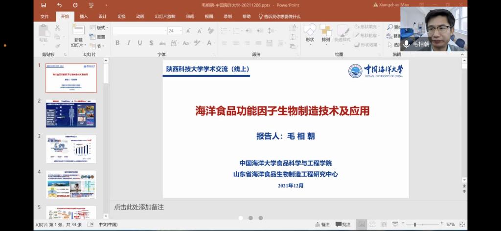12月9日,中國(guó)海洋大學(xué)毛相朝教授應(yīng)邀做客我校前沿科學(xué)報(bào)告,以“海洋功效因子的生物制造技術(shù)及應(yīng)用”為題進(jìn)行學(xué)術(shù)報(bào)告,因疫情影響,采取線下會(huì)場(chǎng)和線上騰訊會(huì)議兩種方式進(jìn)行,報(bào)告會(huì)由食品與生物工程學(xué)院副院長(zhǎng)李國(guó)梁教授主持,食品學(xué)院教師和研究生代表參加了本次報(bào)告會(huì)。