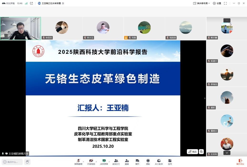 王亞楠教授基于生態(tài)皮革無鉻鞣制關鍵技術、高性能染整關鍵材料為參會師生進行了詳細介紹,從生態(tài)皮革技術的重要性與緊迫性為切入點凸顯皮革行業(yè)綠色轉型是行業(yè)發(fā)展的必然需求,并介紹了發(fā)光細菌法在檢測皮革毒性測試的創(chuàng)新應用及優(yōu)勢。最后,王亞楠教授分享了科研心得,強調研究要“頂天(前沿基礎研究)立地(解決實際問題)”。會后,王亞楠教授與我校師生就平衡材料性能與成本之間的關系、生物質資源循環(huán)利用及可持續(xù)生產(chǎn)的技術可行性、生物質鞣劑在皮革纖維中滲透的檢測方法等問題進行了討論。
