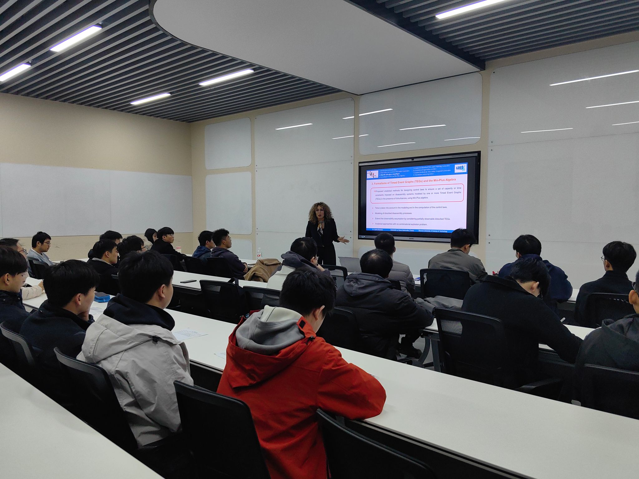 10月22日下午,Bouazza副教授作題為《Control techniques to ensure capacity and time constraints for a class of timed Petri nets with disturbance inputs using dioid algebra》的學(xué)術(shù)報告。該報告進(jìn)一步探討了離散事件系統(tǒng)魯棒控制問題。針對離散事件系統(tǒng)在互斥約束的靜態(tài)優(yōu)化和動態(tài)擾動下的實(shí)時控,通過構(gòu)建Dioid代數(shù)模型,可夠?qū)_動輸入轉(zhuǎn)化為可量化的約束沖突,并設(shè)計動態(tài)控制策略以消解沖突。該方案可用于智能物流系統(tǒng)中實(shí)時調(diào)整任務(wù)優(yōu)先級,確保關(guān)鍵任務(wù)在時間窗內(nèi)完成,同時避免資源過載。