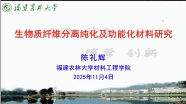 11月4日,應(yīng)科技處、前沿院及輕工學(xué)院邀請(qǐng),福建農(nóng)林大學(xué)“農(nóng)林剩余物纖維素功能材料”科技部創(chuàng)新團(tuán)隊(duì)負(fù)責(zé)人陳禮輝教授做客我?!扒把乜茖W(xué)報(bào)告”,作題為“生物質(zhì)纖維分離提純及功能材料研究”的線上學(xué)術(shù)報(bào)告。輕工學(xué)院相關(guān)專業(yè)教師、研究生參加報(bào)告會(huì)。